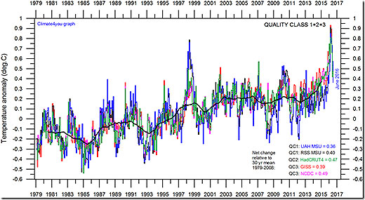 A graph of five global monthly temperatures January 1979 to June/July 2016 is shown below.