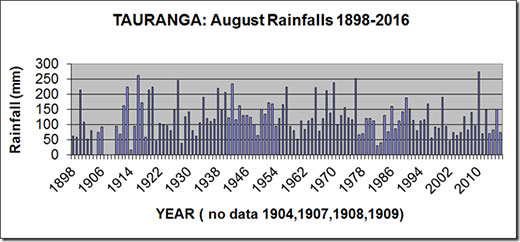 Rainfalls for the month of August have been recorded in Tauranga since 1898, except for 1904, 1907, 1908 and 1909.