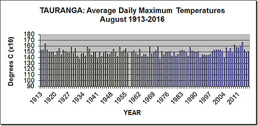 The graph shows details of the average daily maximum temperatures, called simply ‘afternoon' for Tauranga for August from 1913-2015. The average for August 2015 was 15.1 degrees Celsius.