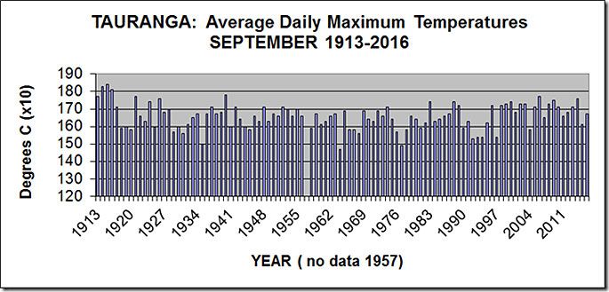The long-term average afternoon temperature in September for Tauranga is 16.6 degrees C, ranging from the 'cool” September months of 1964 (14.8 degrees C), and 1977 (14.9 degrees C), to the 'warm” September months of 1915 (18.4 degrees C), and 18.3 degrees in 1914.