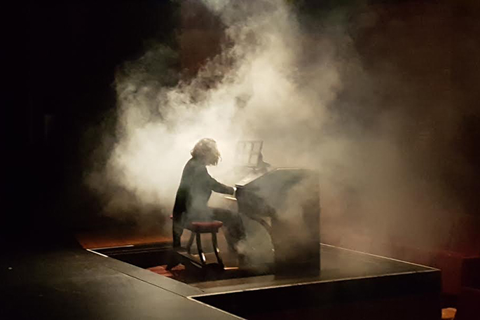 A camera was strapped to Chris Kirkham, and Chris was strapped to a crane and lifted up into the air above Baycourt seating, to be flown down around the rotating Wurlitzer organ onto the stage.
