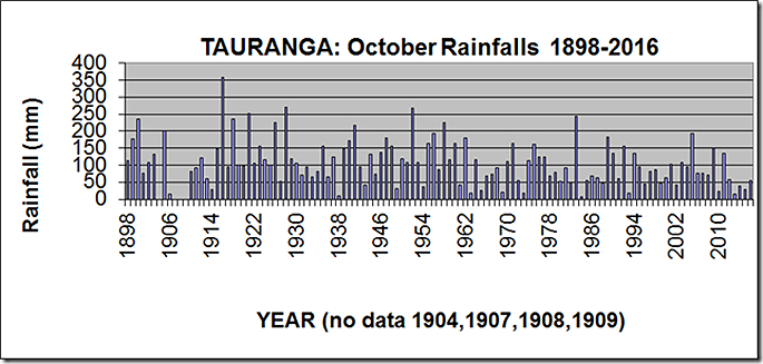 The graph below shows the range of Tauranga's October rainfalls, from an extreme high of 357 mm in 1916 to a low of only 7 mm in 1984.
