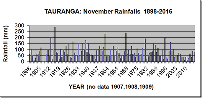 The graph shows the range of November rainfalls from 1898 to 2016 in Tauranga, from an extreme high of 285 mm in 1916 to a low of only 12 mm in 2009.