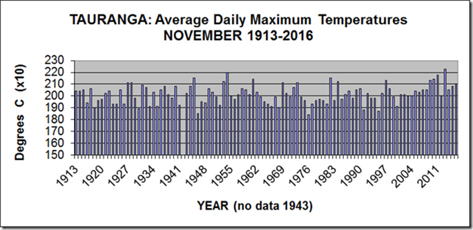 The graph shows details of the average daily maximum temperatures (called simply ‘afternoon') for Tauranga for Novembers from 1913-2016.