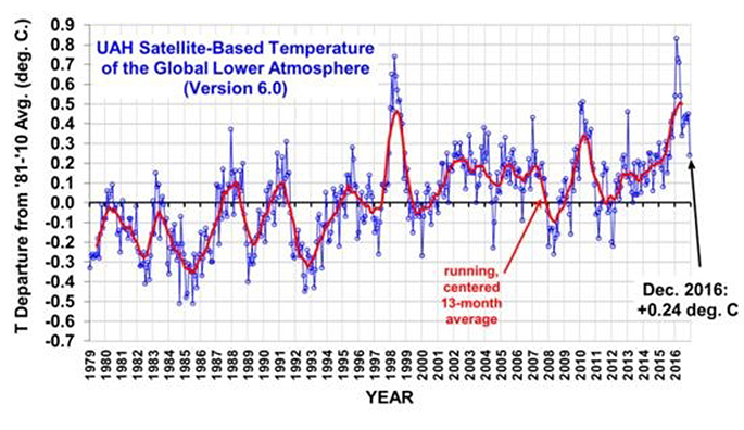 The chart shows the El Nino warming in the 1998 period, and 2015-16, and the Mount Pinatubo, volcanic cooling during 1992-1993.