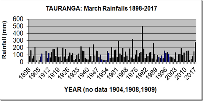 Rainfalls for the month of March have been recorded in Tauranga since 1898 – except for 1904, 1908 and 1909.