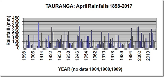 Rainfalls in Tauranga during the month of April 2013 and April 2014 and April 2017 were all relatively wet, with April 2013 recording 284 mm – the seventh highest April rainfall since 1898 – and in April 2014 the total was 225 mm – the 16th highest April rainfall in the city since 1898.