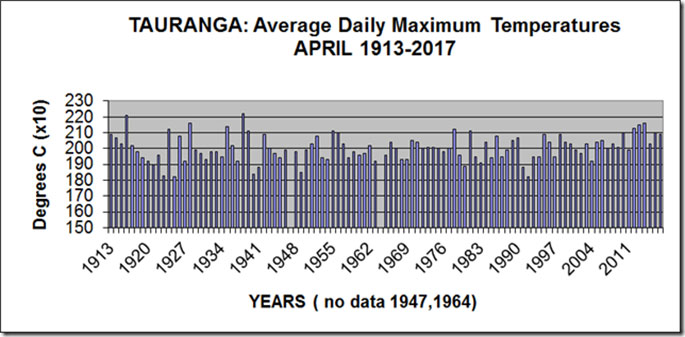 The graph shows details of the average daily maximum temperatures (called simply ‘afternoon'), for Tauranga for April from 1913-2017. Note April 1947 and 1964 are not included because of incomplete data.