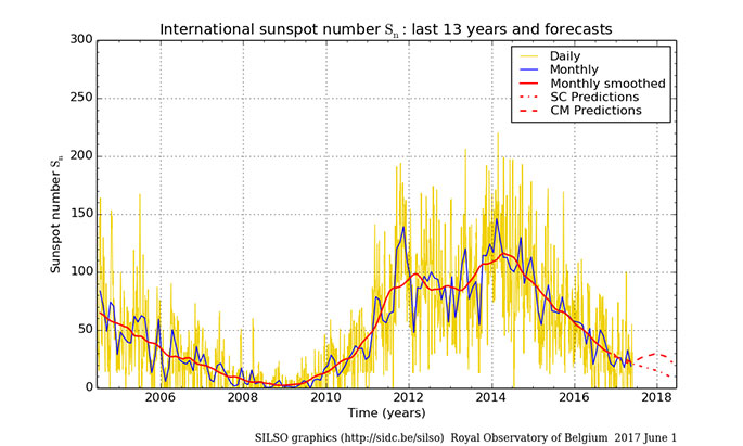 The last time the value was above 200 was in August 1990, when the value was 200.3 – and there were no sunspots observed in September 2009. The value for June 28, 2017 is 27.