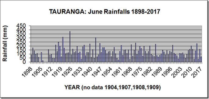 The graph shows the range of rainfalls from an extreme high of 381 mm in 1925 to a low of 19 mm in 1906. There is a small decrease in the overall June rainfalls during the last 50 years, from 1961-2010, from an average of 126 mm, compared with an average of 139 mm during the 50 years from 1911-1960.