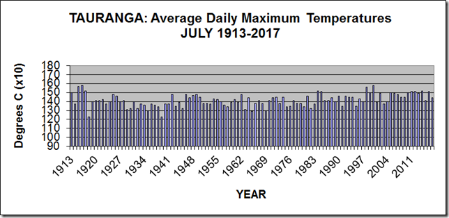 The average afternoon temperature for Tauranga for July for the 50 years from 1914-1963 was 14.0 degrees Celsius, compared with the average afternoon temperature for Tauranga for July for the 50 years from 1964-2013 was 14.3 degrees Celsius.