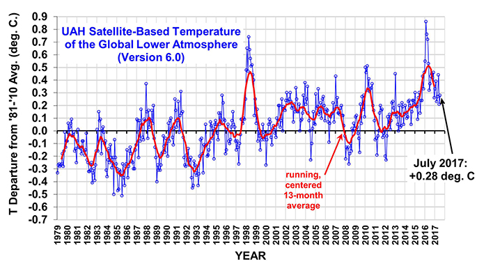 The latest global average temperatures of the troposphere updated to June 2017– observed from US National Oceanic and Atmospheric Administration satellites – are computed by the University of Alabama at Huntsville in the United States. The data shows variations from the 30 year period 1981-2010.
