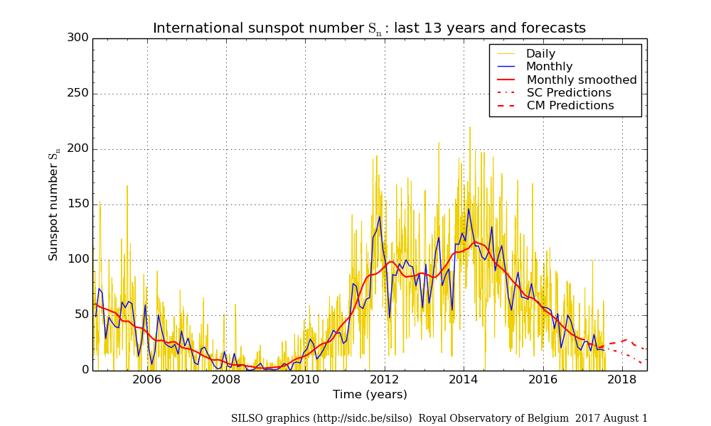 The last time the value was above 200 was in August 1990, when the value was 200.3 – and there were no sunspots observed in September 2009. The value for sunspots on August 27 was 35. Since January 2017, 24% of the days of the year have been 'spotless”. (days without sunspots).