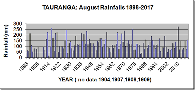 Rainfalls for the month of August have been recorded in Tauranga since 1898, except for 1904, 1907, 1908 and 1909.