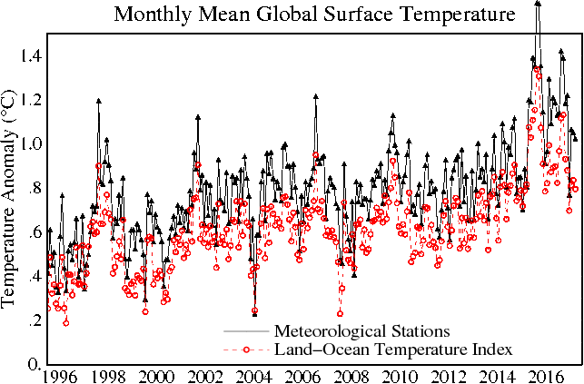 The graph shows the monthly mean global surface temperature anomaly from the base period 1951-1980, for the period 1996- September 2017. The black line shows meteorological stations only; the dotted line is the land-ocean temperature index obtained from satellite measurements.
