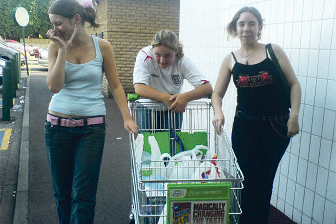 Usually female. Even though they are not the primary propellant of the trolley, they subconsciously cannot trust the nominated trolley driver (usually male, elbows on handlebars as per No.3) to steer correctly.