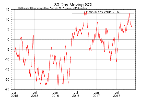 The graph below ( from the Bureau of Meteorology in Australia) shows monthly values of the SOI in recent months updated to mid November 2017.