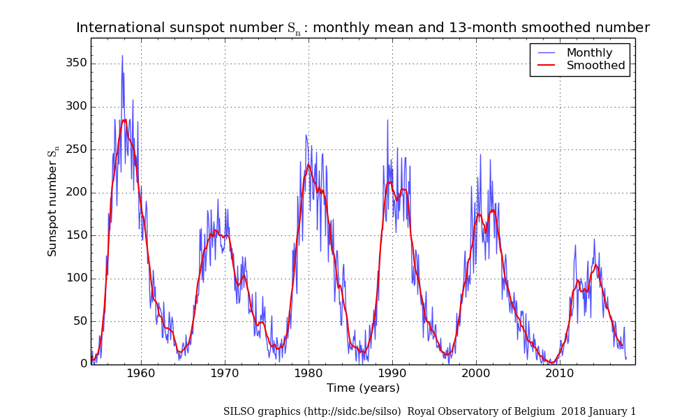 The last time the value was above 200 was in August 1990, when the value was 200.3 – and there were no sunspots observed in September 2009. The value for January 2018 is about 15.