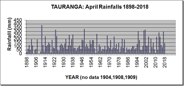 Rainfalls in Tauranga during the month of April 2013 and April 2014 and April 2017 were all relatively wet, with April 2013 recording 284 mm – the seventh highest April rainfall since 1898 – and in April 2014 the total was 225 mm – the 16th highest April rainfall in the city since 1898.