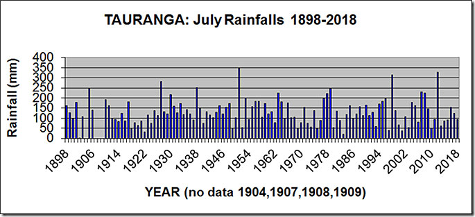 Rainfalls for the month of July have been recorded in Tauranga since 1898, except for 1904, 1907, 1908, and 1909.