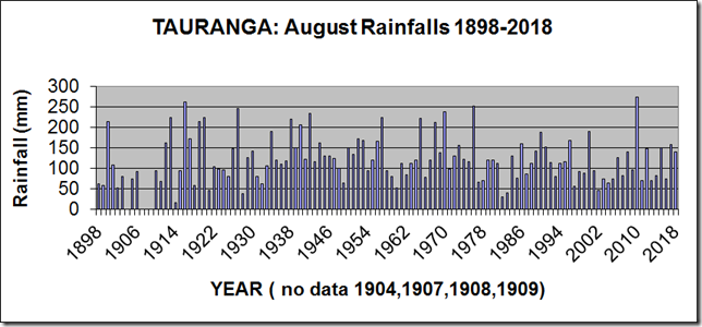 Rainfalls for the month of August have been recorded in Tauranga since 1898, except for 1904, 1907, 1908 and 1909.