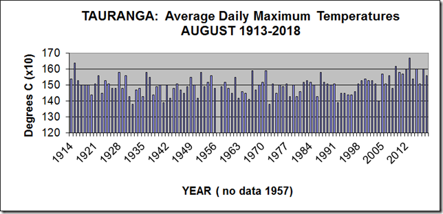 The graph shows details of the average daily maximum temperatures, called simply ‘afternoon' for Tauranga for August from 1913-2018. The average for August 2018 was 15.6 degrees Celsius.