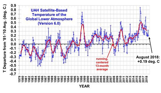 The latest global average temperatures of the troposphere updated to January 2018 - observed from US National Oceanic and Atmospheric Administration satellites – are computed by the University of Alabama at Huntsville in the United States. The data shows variations from the 30 year period 1981-2010.