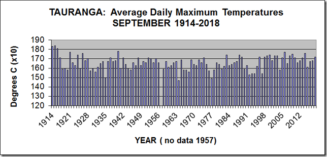 The graph shows details of the average daily maximum temperatures (simply called 'afternoon”) for Tauranga for September from 1913-2018.
