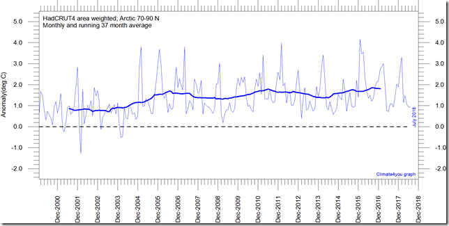 Diagram showing area weighted Arctic (70-90 degrees N) monthly surface air temperature anomalies (HadCRUT4) since January 2000, in relation to the WMO normal period 1961-1990. The thin line shows the monthly temperature anomaly, while the thicker line shows the running 37-month (c. 3 year) average.
