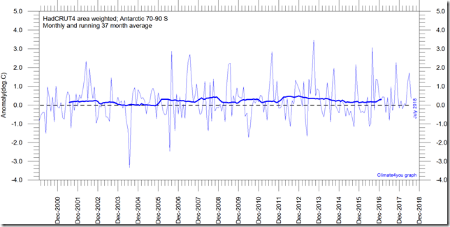 Diagram showing area weighted Antarctic (70-90 N) monthly surface air temperature anomalies (HadCRUT4) since January 2000, in relation to the WMO normal period 1961-1990. The thin line shows the monthly temperature anomaly, while the thicker line shows the running 37-month (c. 3 year) average.