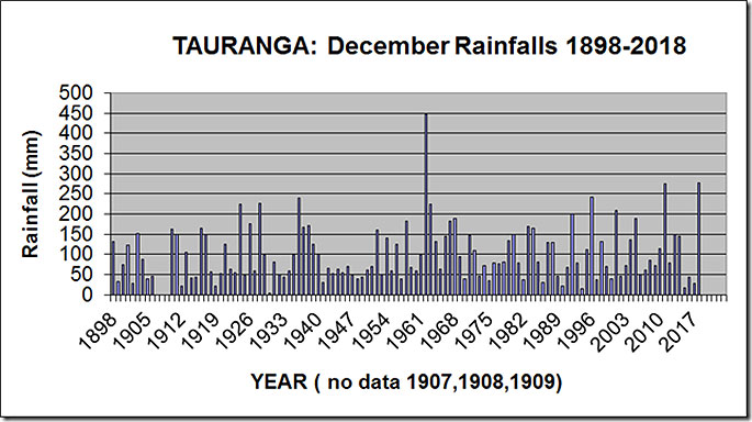 However, there has been an increase in December rainfalls during the last few decades. Indeed, the average December rainfall in Tauranga for the 50-year period from 1961-2010 of 109 mm, is 20 per cent higher than the rainfall for the 50-year period 1911-1960. In contrast, three recent December months (2015, 2016, 2017) have had low rainfalls of 18 mm, 44 mm, and 29 mm.