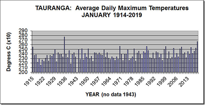 The graph above shows details of the average daily maximum temperatures (called simply ‘afternoon') for Tauranga for January from 1914-2019.