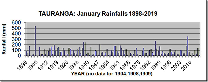 The graph shows the range of Tauranga's January rainfalls from 1898-2019, varied from an extreme high of 532 mm in 1907 to a low of only 1 mm in 1928.