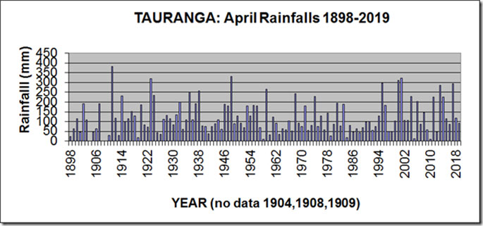 The long-term average rainfall for Tauranga for April is 120 mm.