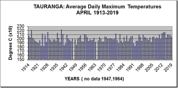 The long-term average afternoon temperature in April for Tauranga for is 20.0 degrees Celsius, ranging from the cool April months of 1925, with an average afternoon temperature of 18.2 degrees Celsius, and 1923 with an average afternoon temperature of 18.3 degrees Celsius, to the warm April months of 1938 (22.2 degrees Celsius), and 1916 (22.1 degrees Celsius).