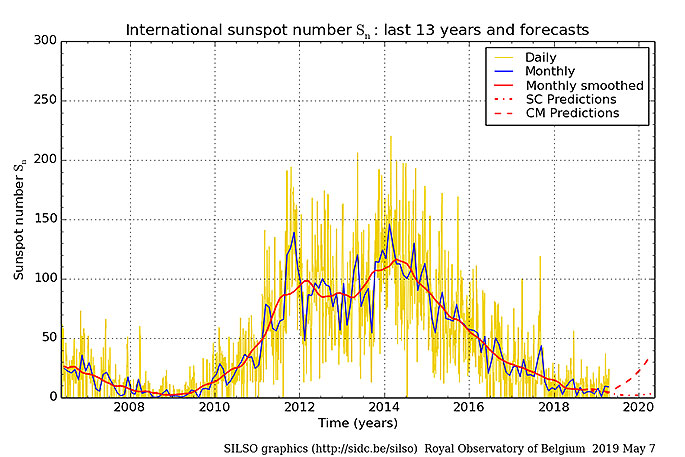 The sunspot number for the last seven days ending May 26 2019 is zero.