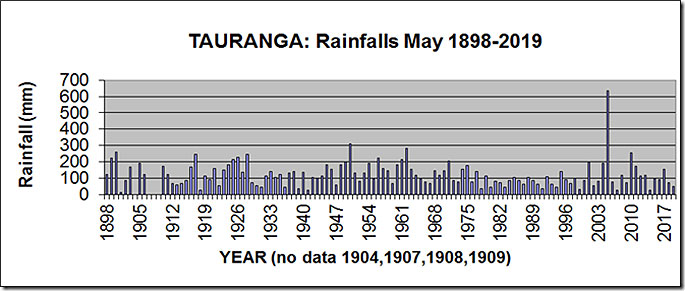 Rainfalls for the month of May have been recorded in Tauranga since 1898 – except for 1904, 1907, 1908, and 1909.