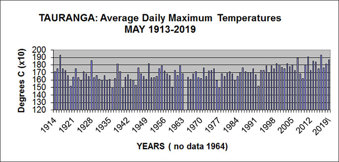 The average afternoon temperature in Tauranga in May 2019 was 18.7 degrees C, the fifth warmest on record.
