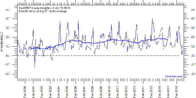 The chart shows area weighted Arctic (70-90 degrees N) monthly surface air temperature anomalies (HadCRUT4) since January 2000, in relation to the WMO normal period 1961-1990. The thin line shows the monthly temperature anomaly, while the thicker line shows the running 37-month (c. 3 year) average.