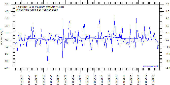 Diagram showing area weighted Antarctic (70-90 N) monthly surface air temperature anomalies (HadCRUT4) since January 2000, in relation to the WMO normal period 1961-1990. The thin line shows the monthly temperature anomaly, while the thicker line shows the running 37-month (c. 3 year) average.