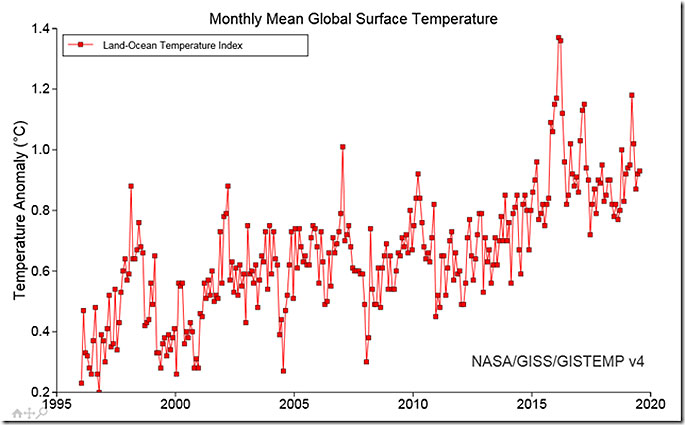 The graph shows the monthly mean global surface temperature anomaly from the base period 1951-1980, for the period 1996- July 2019.