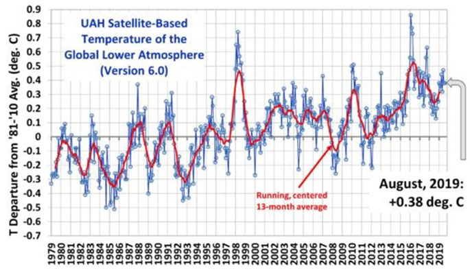 The latest global average temperatures of the troposphere updated to August 2019 - observed from US National Oceanic and Atmospheric Administration satellites – are computed by the University of Alabama at Huntsville in the United States. The data shows variations from the 30 year period 1981-2010.