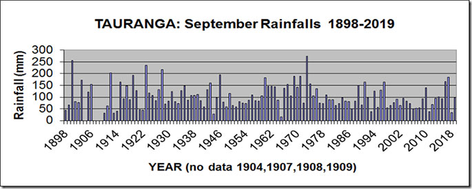 Rainfalls for the month of September have been recorded in Tauranga since 1898, except for 1904, 1907, 1908, and 1909.