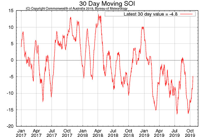 The SOI is effectively a measure of the barometric pressure difference between Tahiti and Darwin and can be regarded as a key indicator of the overall state of the global climate at the time. The chart below from the Australian Bureau of Meteorology shows the values of the SOI from January 2017 to October 2019. .