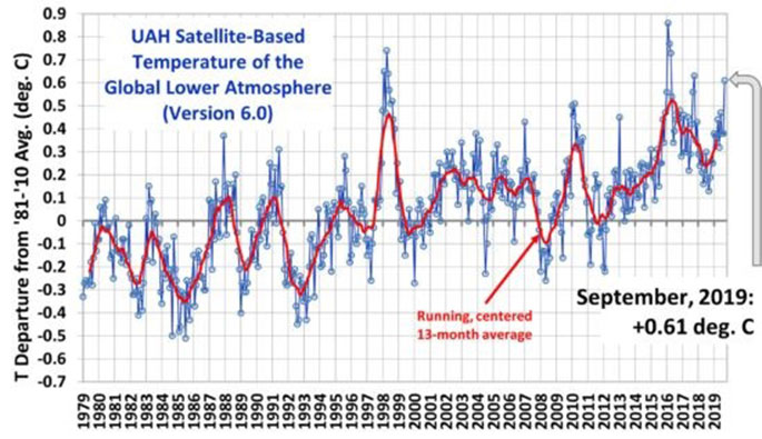 The latest global average temperatures of the troposphere updated to October 2019 - observed from US National Oceanic and Atmospheric Administration satellites – are computed by the University of Alabama at Huntsville in the United States. The data shows variations from the 30 year period 1981-2010.