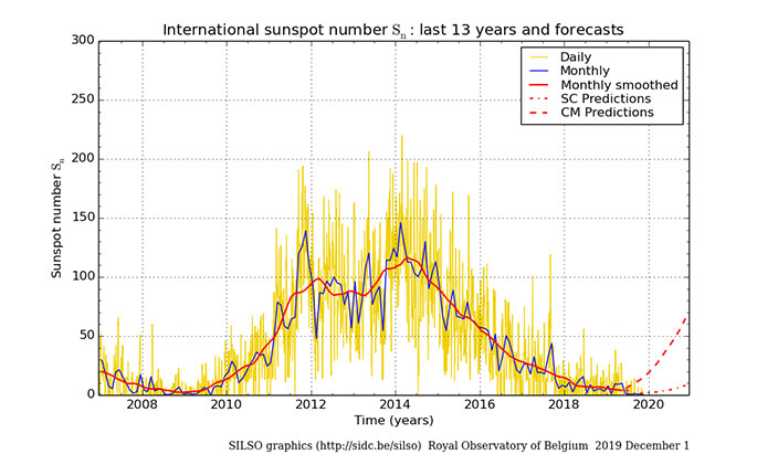 As of December 1, 2019 there have been 254 days in 2019 without sunspots, and with 30 days remaining in the calendar year, the forecast by many solar scientists is that the 2019 will have over 280 days with sunspots, which would make 2019 the second or third most 'spotless” year since records began in 1849.