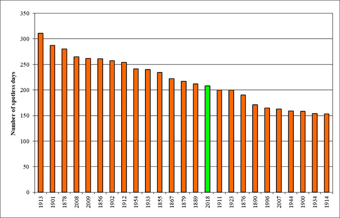 Since 1849, there have been 114 years (including 2019) with at least one spotless day. The chart below shows the 25 years with the highest number of spotless days. 1913 had 311 spotless days, while 2008 ranks fourth in years with a spotless sun (265 days). With 208 days, 2018 (green bar) has nested itself into the top 25 years with most spotless days.