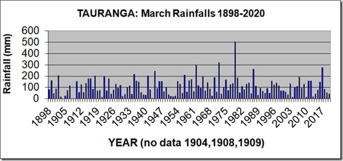Rainfalls for the month of March have been recorded in Tauranga since 1898 – except for 1904, 1908 and 1909.