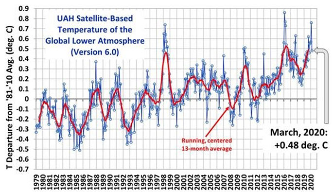 The latest global average temperatures of the troposphere updated to February 2020 - observed from US National Oceanic and Atmospheric Administration satellites – are computed by the University of Alabama at Huntsville in the United States. The data shows variations from the 30 year period 1981-2010.