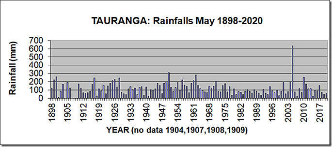 Rainfalls for the month of May have been recorded in Tauranga since 1898 – except for 1904, 1907, 1908, and 1909.
